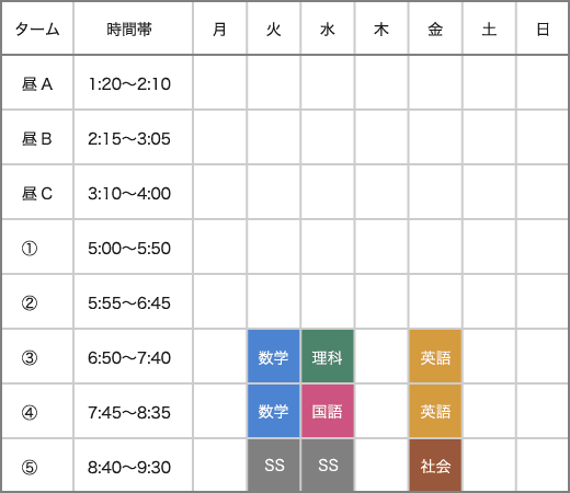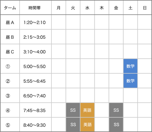 ※SS:self-study(自習)、開校日であればいつでも自習室を利用できます。