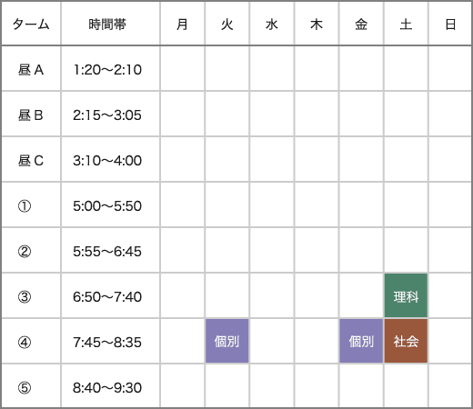 個別との併用  理科・社会各週1時限受講の場合 ※カリキュラムはお申込内容により異なります。