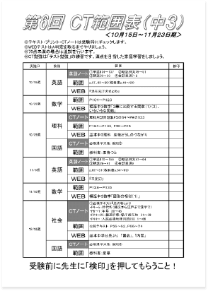 毎週行われる塾内テストです。事前にテスト範囲を配付し、テストに向けて準備することを促します。学習した内容をどれだけ身につけているかを試すテストであり、卒業生が残した膨大なデータによる志望校別目標得点を明示することで、生徒の毎週の学習目標を具体的にします。