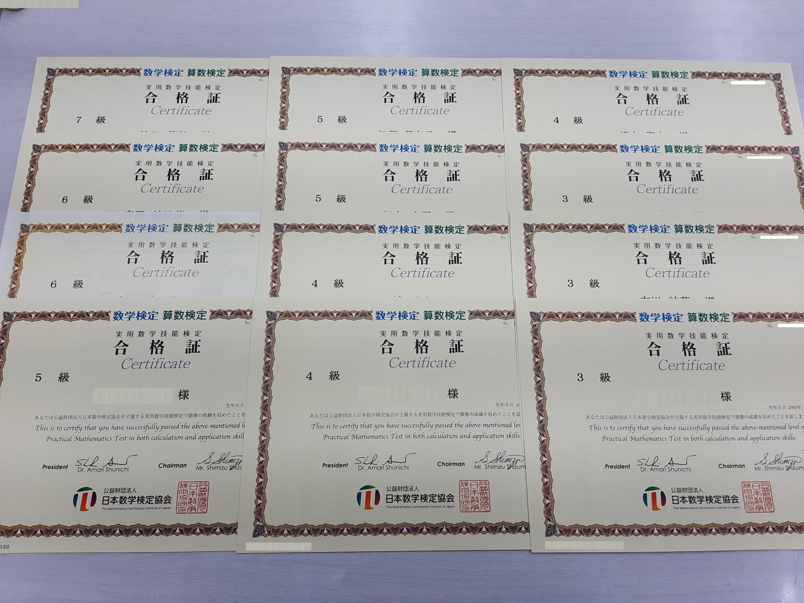 2020.12.5に行われた算数検定・数学検定の合格証が届きました。御津教室からは、小学5年生から中学3年生までの、全12名が受検し、見事、全員合格!