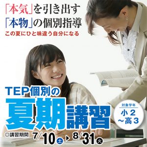 7/10から8/31の期間で、夏期講習を開催いたします! TEP個別の夏期講習は、この夏に「苦手科目を克服したい」「得意科目を伸ばしたい」「英検合格に向けて勉強をしたい」「志望校の受験対策を始めたい」などの目標を持つみなさんのために、一人ひとりに合わせた授業と、わかるまで、できるまで徹底的に指導する...
