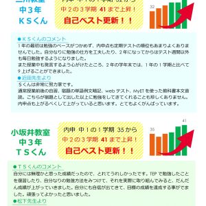 3学期の内申がこれまでで一番よかった2人のTEP生をご紹介します!1年から2年にかけて上げ続けています。とても良く頑張っていますね。この調子で3年生もベストを尽くしましょう!
