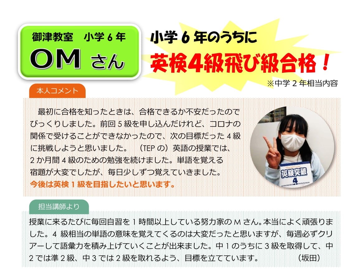 今回掲載した子のように、英検の飛び級合格者も増えてきています。1つでも学年相当級より上の級を受験するには、学校では習っていない範囲の学習が必要になるので、飛び級合格はその内容を勉強して身に付けた証です。検定合格という目標をもつことで、勉強に対するやる気も出ますし、予習にもなるので一石二鳥ですね!ぜひ彼女たちのように、上の級を目指す子が今後も増えていってほしいと思います。