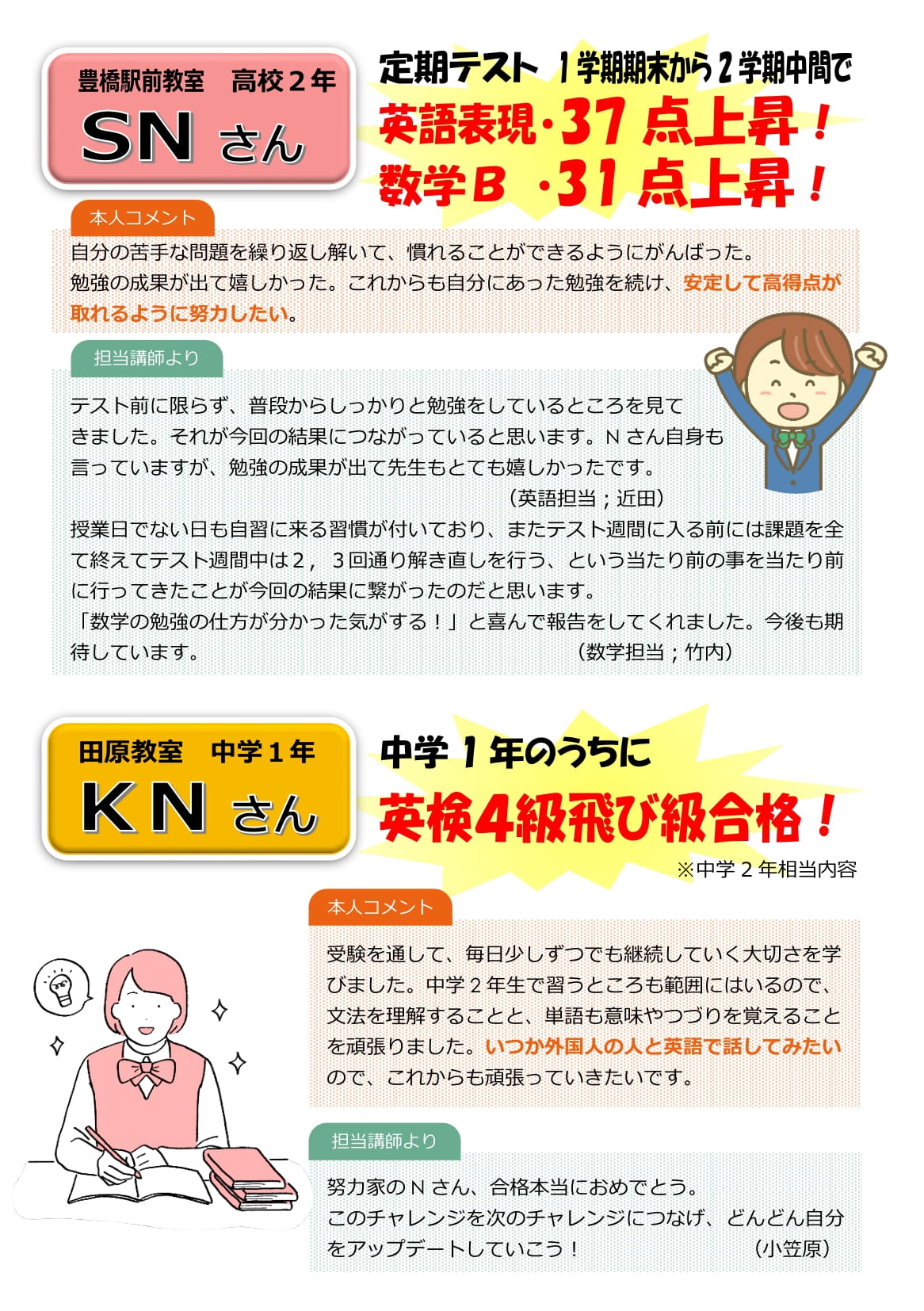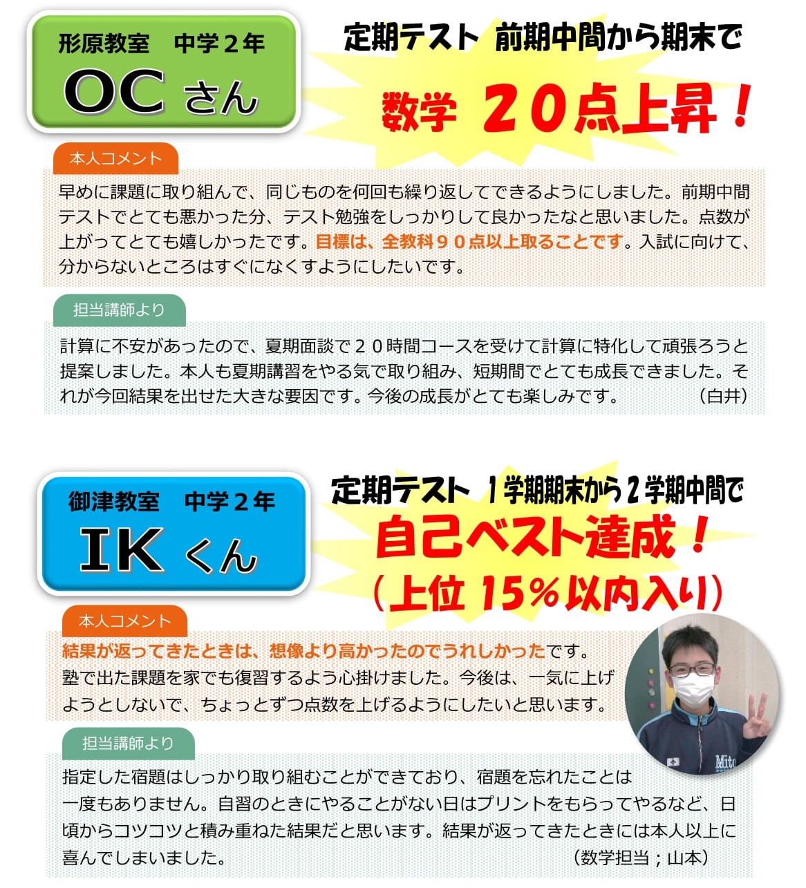 2学期の間に成長できた!目標に届いた!という生徒の声を何名かご紹介します。期末テストでも良い報告を期待しています!