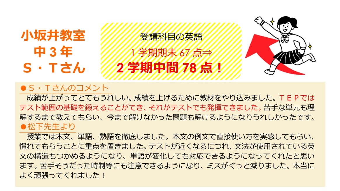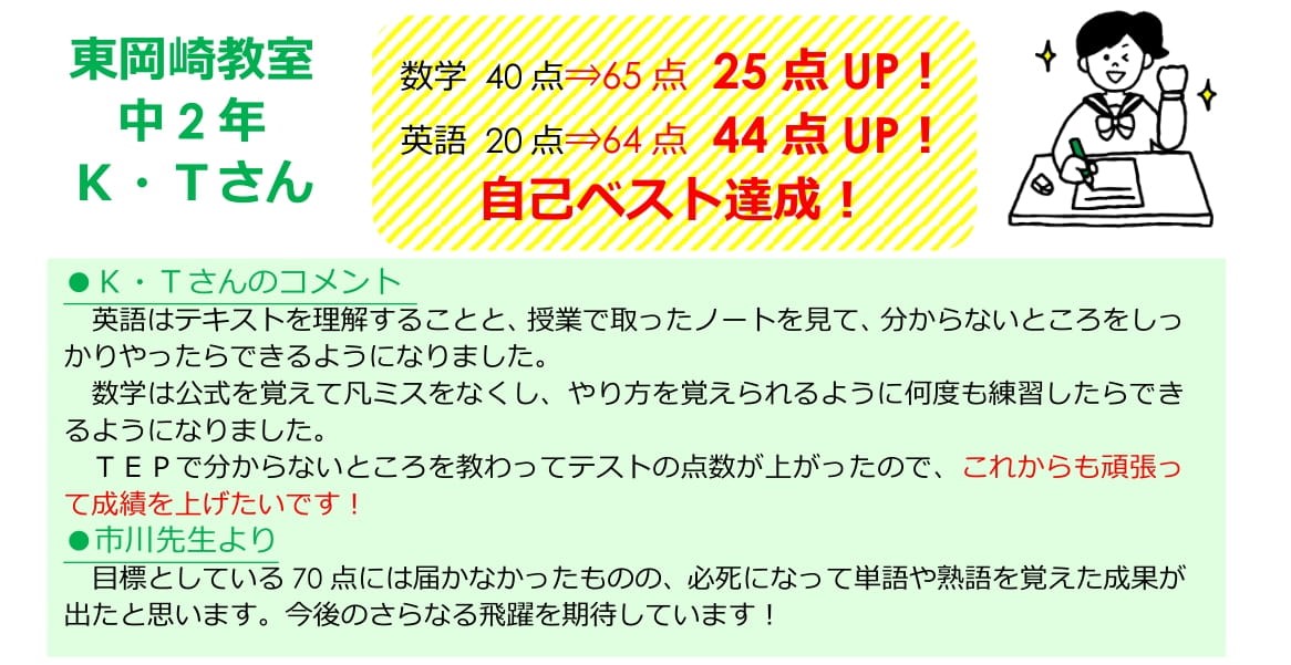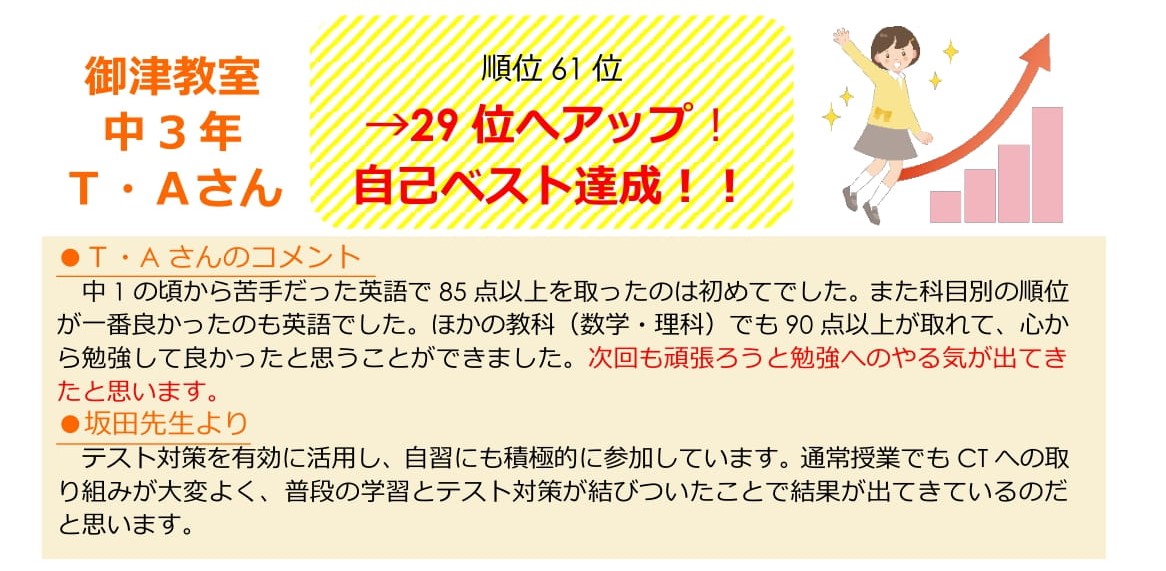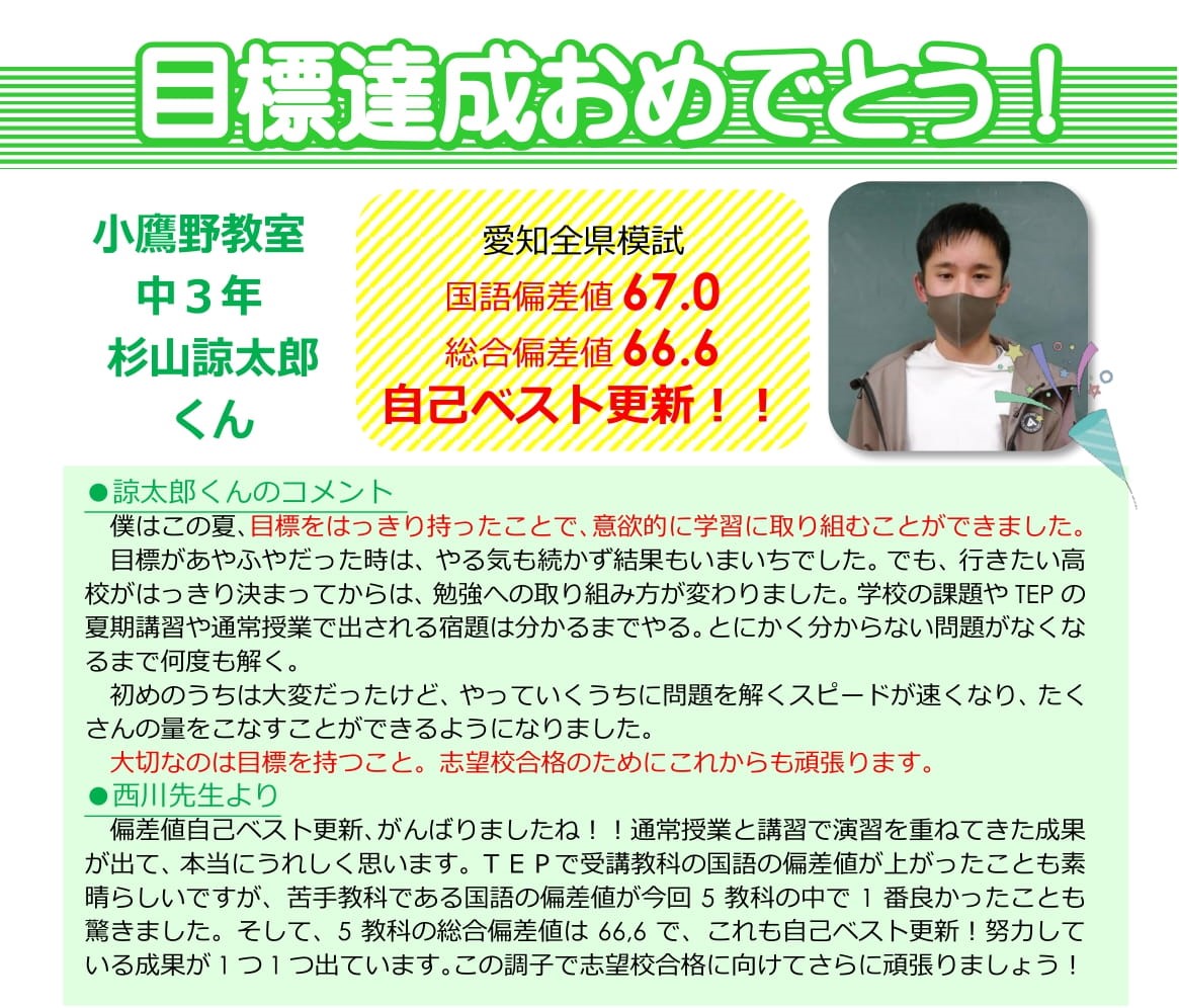 今回は2学期中間テスト、または8月に行われた愛知全県模試で、目標を達成した生徒を一部ご紹介します!