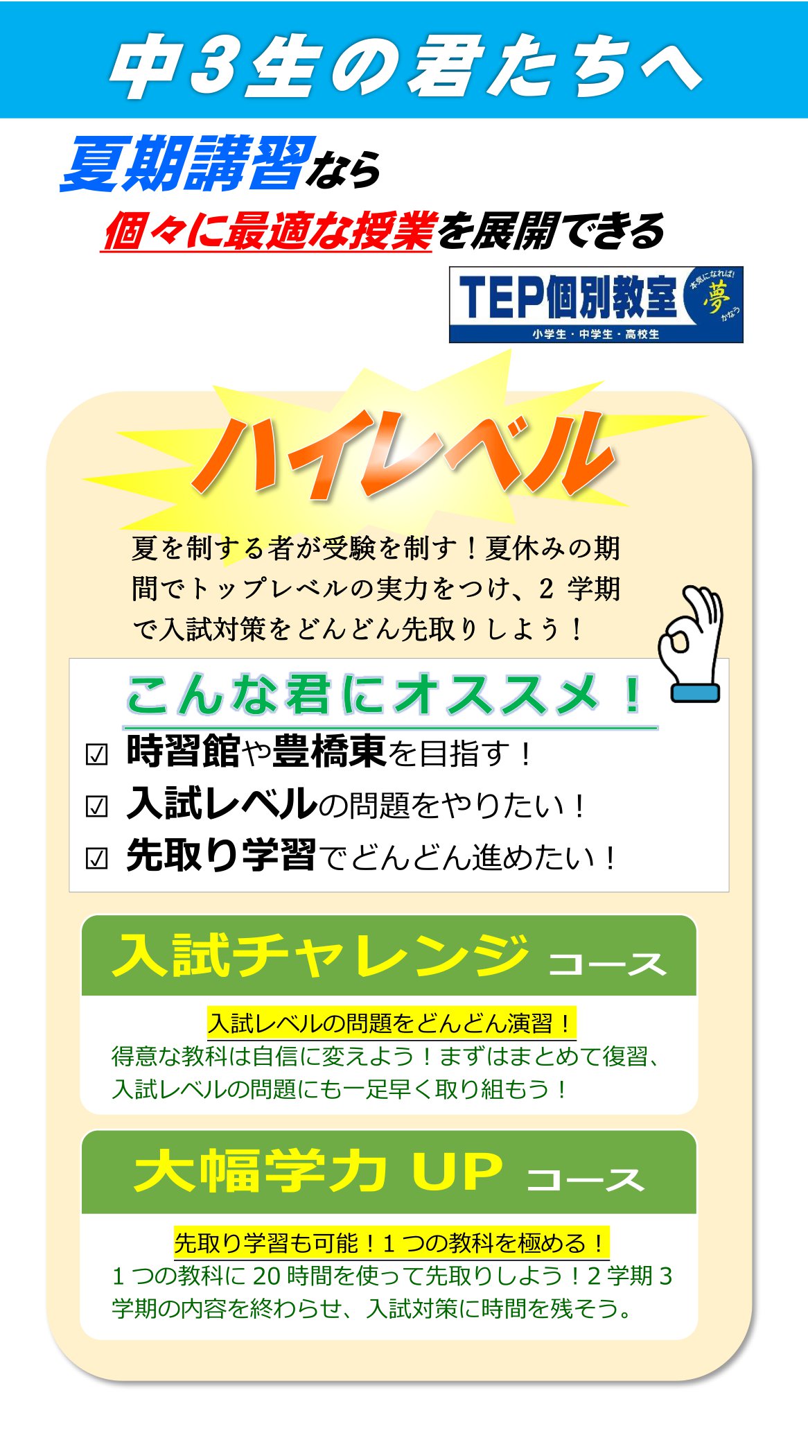 中3生の君たちへ ~TEP夏期講習は個々のレベルに対応します~