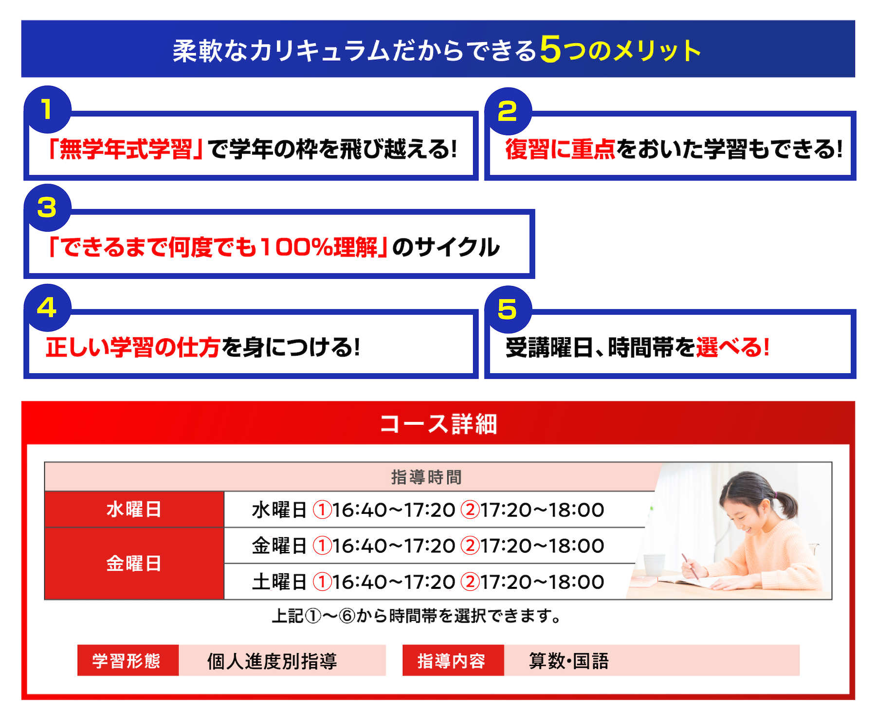 学習内容を反復して繰り返し学ぶことによって、記憶を定着させ、理解を深めることができます。お子様の理解度に応じて、個別に柔軟に対応します。